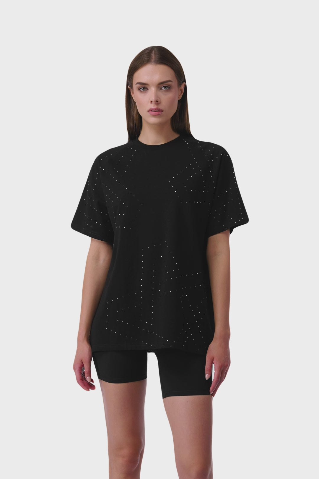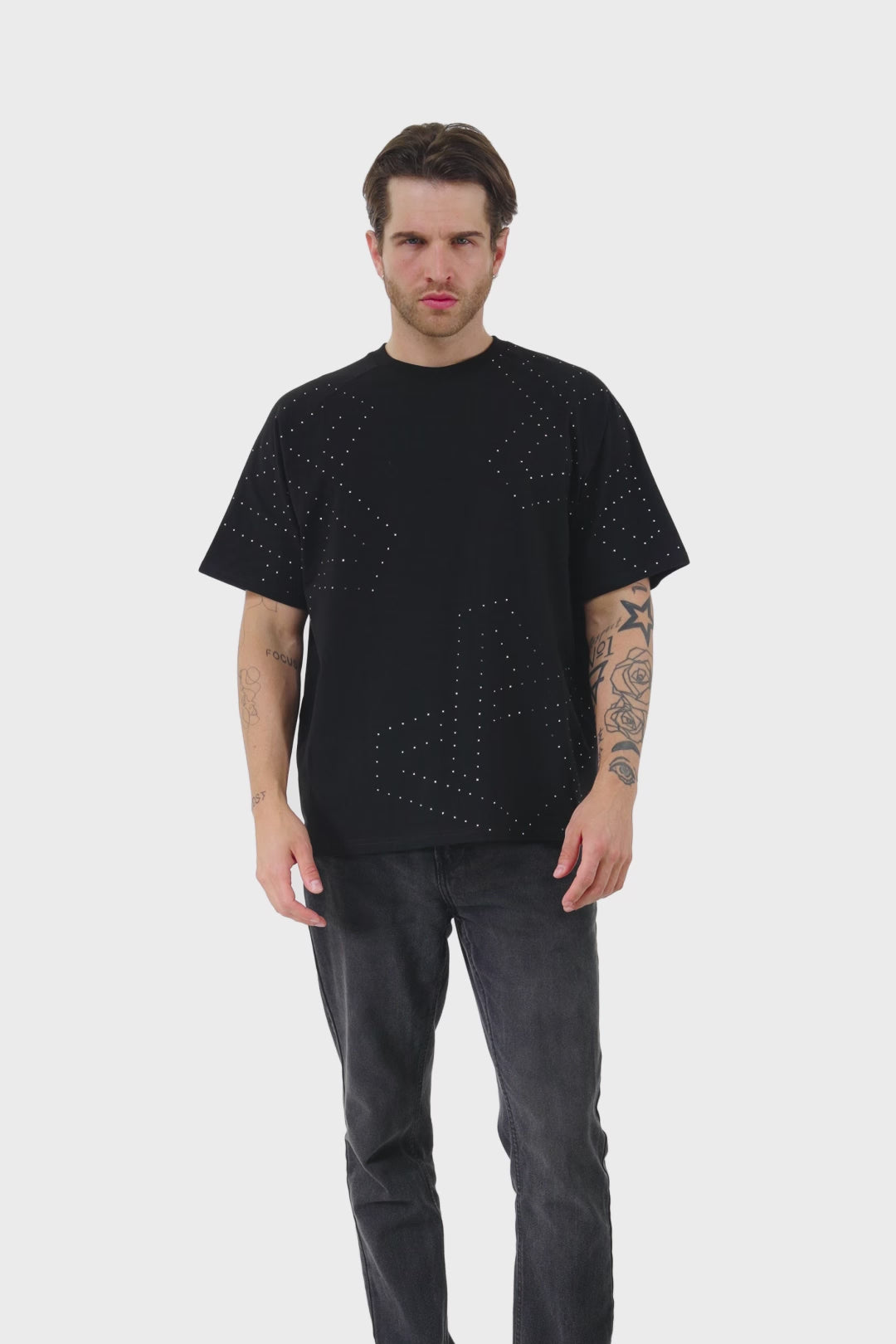 Stellar shine meets streetwear edge — the Galaxia T-Shirt Black is decked out with white rhinestones that scatter like stars across a deep black sky. Designed to glow in motion and own the night. Gravity? Optional.