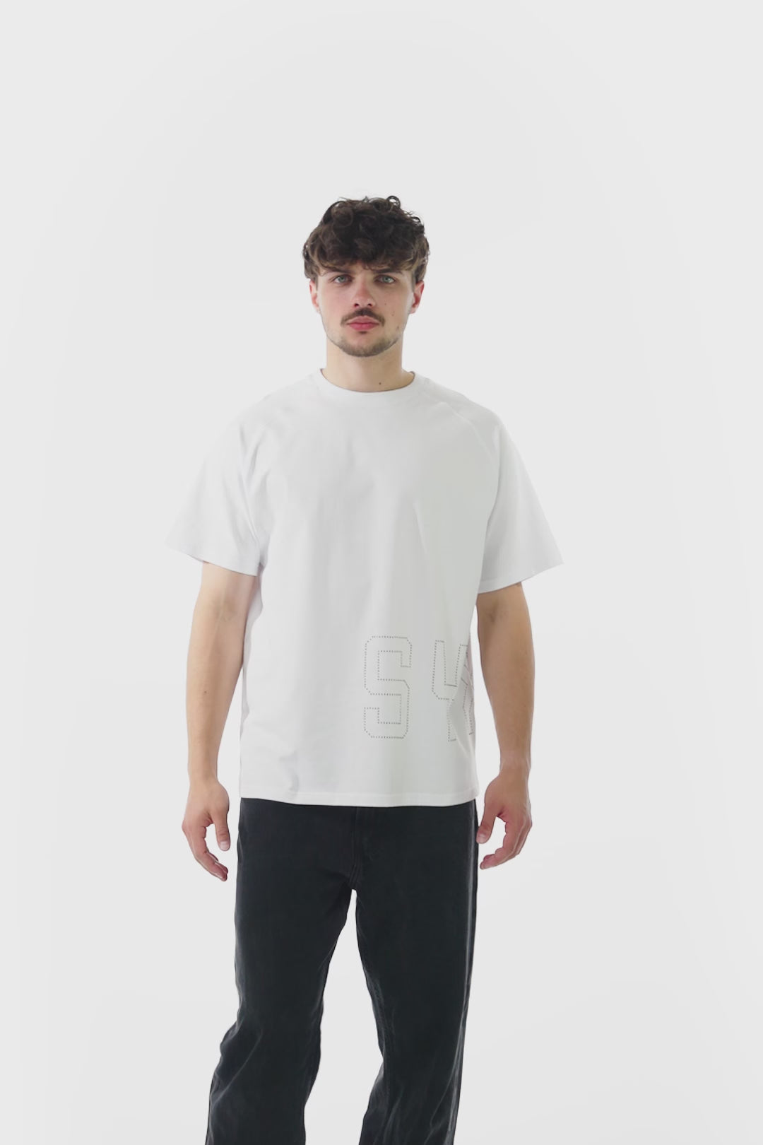 Bold contrast, clean energy — the Glitz T-Shirt White features a sharp SYXED logo outlined with black rhinestones across the chest. A fresh white base meets graphic edge, turning minimalism into a full statement.
