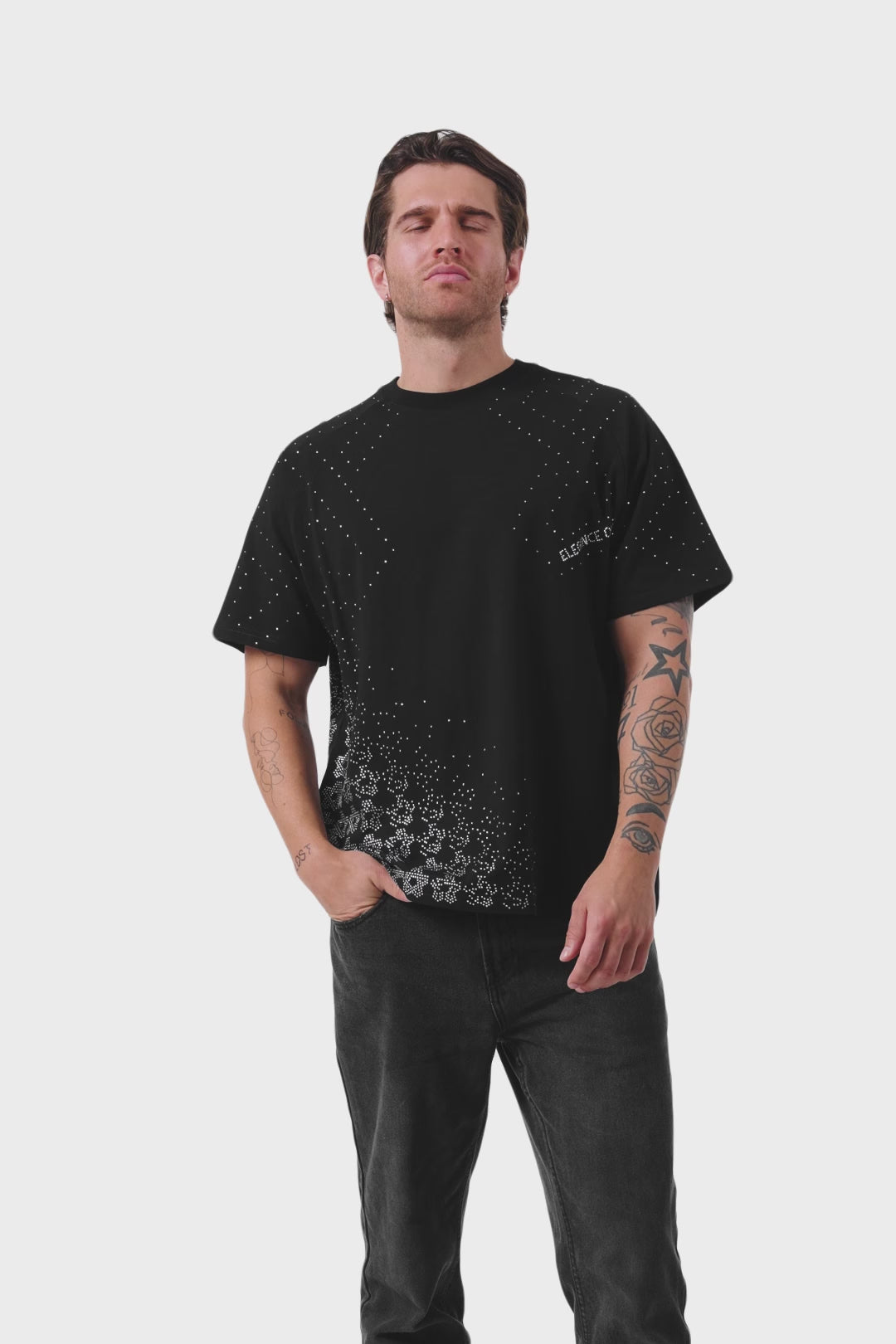 Clean cut, crystal shine — the Lumina T-Shirt in black is detailed with shimmering white gems that add just the right touch of bold elegance. Minimalist from afar, radiant up close — made to glow without trying too hard.